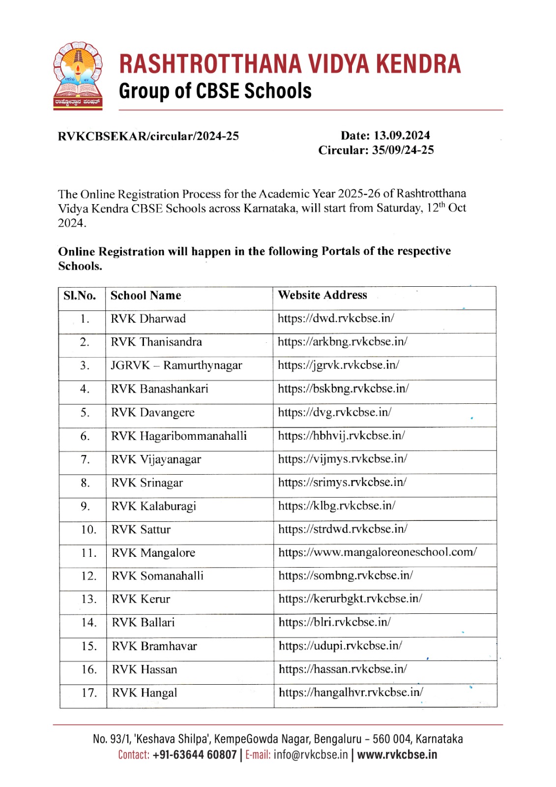 RVK CBSE Schools Registration for 2025-26 will start from 12th Oct 2024, Vijayadashami Day.Rashtrotthana Vidya Kendra Group of CBSE Schools is having 17 Schools across Karnataka, including 3 Upcoming Schools in Udupi, Hassan & Hangal.