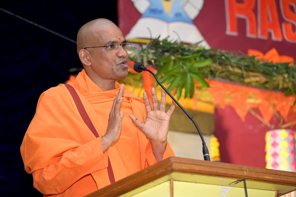 Dharwad, Mar. 7: “Indian culture is disappearing in modern education. Students are being influenced by Western culture. For that, it is not enough if the educational institutions only provide education. Only if human qualities are developed in children along with education can a child become a good citizen. If a person is selfish, he is like an animal. Only if he is selfless does he become a good human being. Indian culture is an exemplary culture for others. The heavy responsibility of preserving and developing that culture lies on today’s children,” said Param Pujya Sri Mokshaatmaananda Swamiji of Belgaum Ramakrishna Mission Ashram, blessing them. He spoke after presiding over the Sankalpotsava program for the 10th and 12th grade students of the year 2025-26 held at Rashtrotthana Vidya Kendra – Dharwad, Neeralkatti. Dr Anita Rai, the principal of the school, taught the children the Sankalpa. Raghavendra Ambekar, the school secretary, presided over the function and delivered the introductory remarks. The program included programs such as Veda Ghosha, Bhagavad Gita recitation, Sankalpa teaching, Mata-Pitru Pada Pooja, and distribution of mementoes.